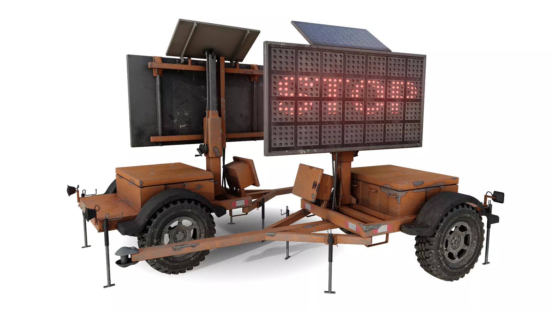 This highly detailed 3D model features a Variable Message Sign with an aged finish, perfect for urban scenes. The carefully crafted textures showcase dust accumulation, subtle rust, and faded paint, adding realism and authenticity to any project. Ideal for games, architectural visualization, and animations. Optimized for efficient performance without compromising visual quality.