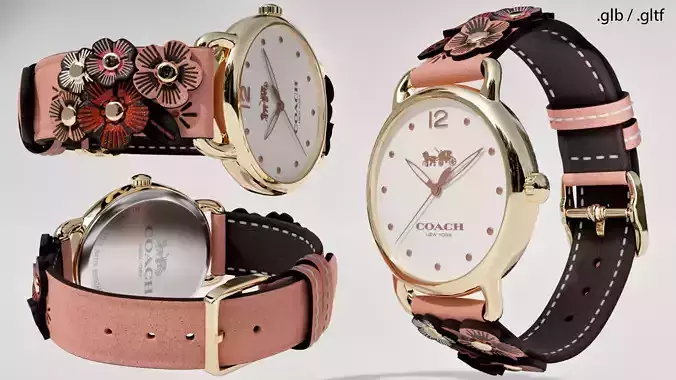 Women's watches for true connoisseurs of beauty!This is a high-quality, realistic 3D model of a luxury wristwatch (inspired by iconic designer brands like Coach) featuring a gold-finished round case, minimalist dial, and a unique leather strap decorated with floral appliqués. This model is perfect for product visualization, e-commerce, virtual try-ons, and detailed close-up renders.
