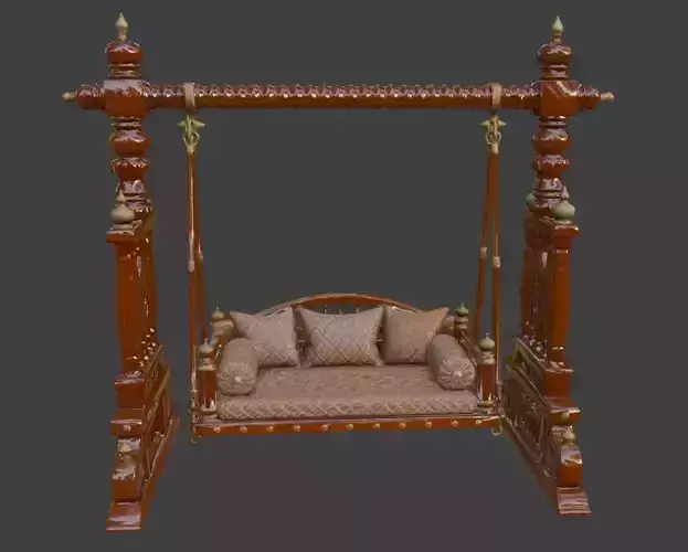 Elevate your interior with this exquisite traditional Indian wooden swing (jhula), meticulously crafted in a rich teak-inspired finish with intricate carvings and royal detailing. Perfect for living rooms, patios, or luxury home decor, this ornate swing features a beautifully sculpted frame with turned pillars, decorative finials, and a plush cushioned seat adorned with elegant patterned fabric and bolsters. The timeless design captures the essence of Indian palace architecture, making it an eye-catching statement piece for any sophisticated space. Ideal for photography, architectural visualization, or high-end residential projects. High-poly 3D model with detailed textures, ready for rendering in any professional software.