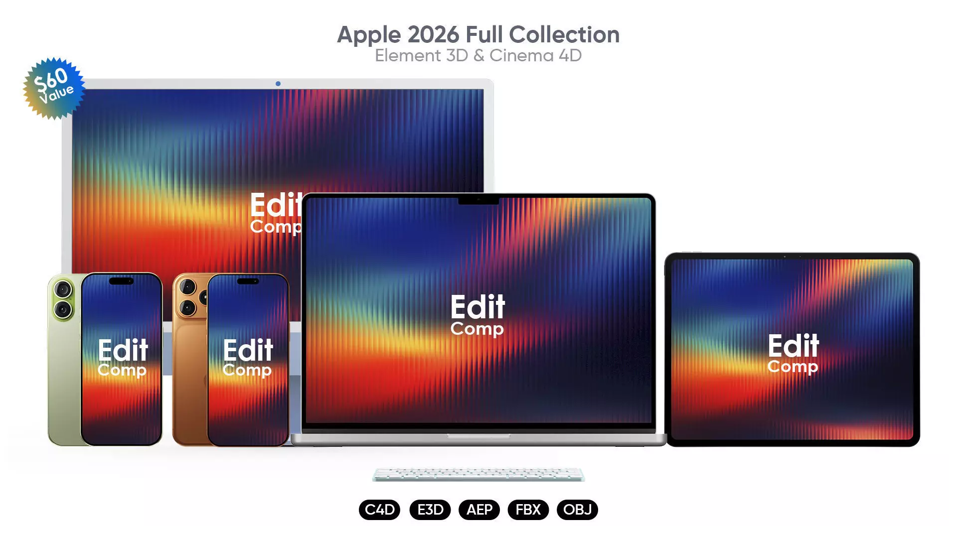 Generate endless mock-ups using this pack of Apple devices. Detailed 3D models for the iPhone 17 Pro Max / iPhone 17 / iPad Pro M5 – MacBook Pro M5 14” / iMac M4. Accurate device dimensions ensure realistic renders when placed near each other. Available for Element 3D and Cinema 4D, included After Effects screen templates. Additional 3D formats available.