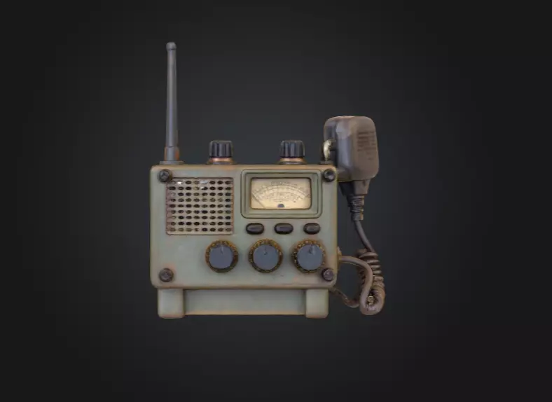 Built as a portable transceiver unit, the model features tactile knobs, a coiled handset cable, ventilation grill, and antenna — each carefully weathered with PBR materials to reflect decades of use. Scratches, oxidation, and subtle paint chipping give it an aged industrial look, while the illuminated meter and tactile buttons make it feel truly functional.