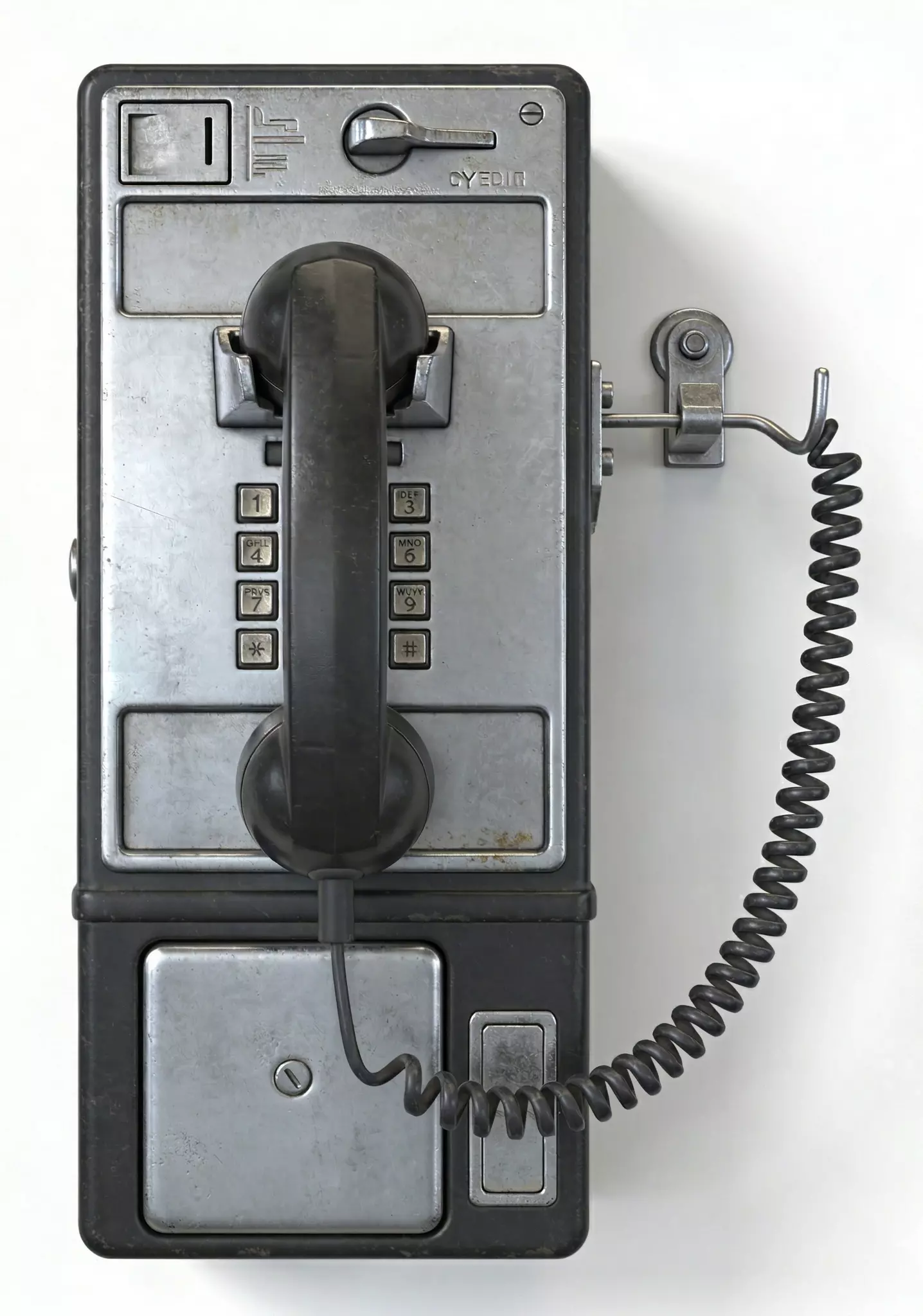 Weathered Stainless Steel and Cast Iron FinishThe payphone features a primary body construction of brushed stainless steel panels and a dark cast iron frame, meticulously modeled with realistic surface oxidation, localized mineral tarnish, and prominent public-use scuffing. This professional and grounded appearance tells a clear story of decades of outdoor service and environmental exposure, providing a sharp visual contrast against the dark plastic handset.