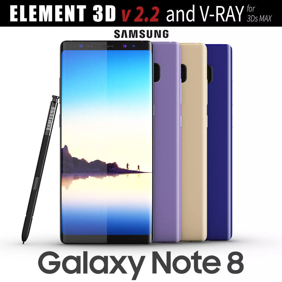 Realistic (copy) 3d model of Samsung Galaxy Note 8 All colors. This set: 3D element v2.2 The model given is easy to use - 1 file obj standard - 1 file 3ds Max 2013 vray material - 1 file of 3Ds - file e3d full set of materials, like a preview How to use it? 1. Discovery after the impact of CC 2014 (or above) and create a new composition (you need Element3D v2.2 to use) 2. Create a new solid layer and add the effect of the elements. (Effect / Video Copilot / Element) 3. Select Install Location 4. Click on the import inside the Element3D Installation location 5. Select my .e3d according to the model and click on the open button. If you do not see the model, do not forget to right click on the model name and press the replace model select. Topology of geometry: - forms and proportions of The 3D model - the geometry of the model was created very neatly - there are no many-sided polygons - detailed enough for close-up renders - the model optimized for turbosmooth modifier - Not collapsed the turbosmooth modified - apply the Smooth modifier with a parameter to get the desired level of detail Materials and Textures: - 3ds max files included Vray-Shaders - all texture paths are cleared Organization of scene: - to all objects and materials - real world size (system units - mm) - coordinates of location of the model in space (x0, y0, z0) - does not contain extraneous or hidden objects (lights, cameras, shapes etc.)