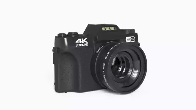 This realistic digital camera 3D model is inspired by a modern compact camera design featuring 4K Ultra HD marking, Wi-Fi support label, and a detailed zoom lens. The model is created for product visualization, advertising renders, e-commerce mockups, and commercial projects.It has accurate proportions, clean hard-surface modeling, and realistic materials, making it suitable for close-up studio renders as well as general scene use. The neutral black body with lens detailing fits a wide range of professional and consumer electronics visuals.PBR textures 4k resolutions in 2 colorsPBR Materials: Includes Base Color, Roughness, Normal, Emissive, opacity, and Metallic.High-Resolution Textures: 4K texture maps for detailed and crisp rendersSuitable for animationFormats Included: .blend, .fbx, .obj, .mtl and othersGame & Render Ready: Ideal for real-time engines like Unity and Unreal, as well as offline rendering