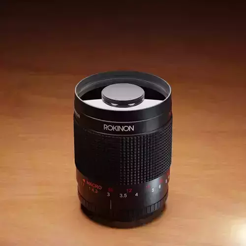 The Rokinon 500mm mirror lens, a telescope lens for a dslr camera. This model is created in Blender 3D, rendering using cycles but material is EEVEE ready. Feel free to request other formats if needed.
