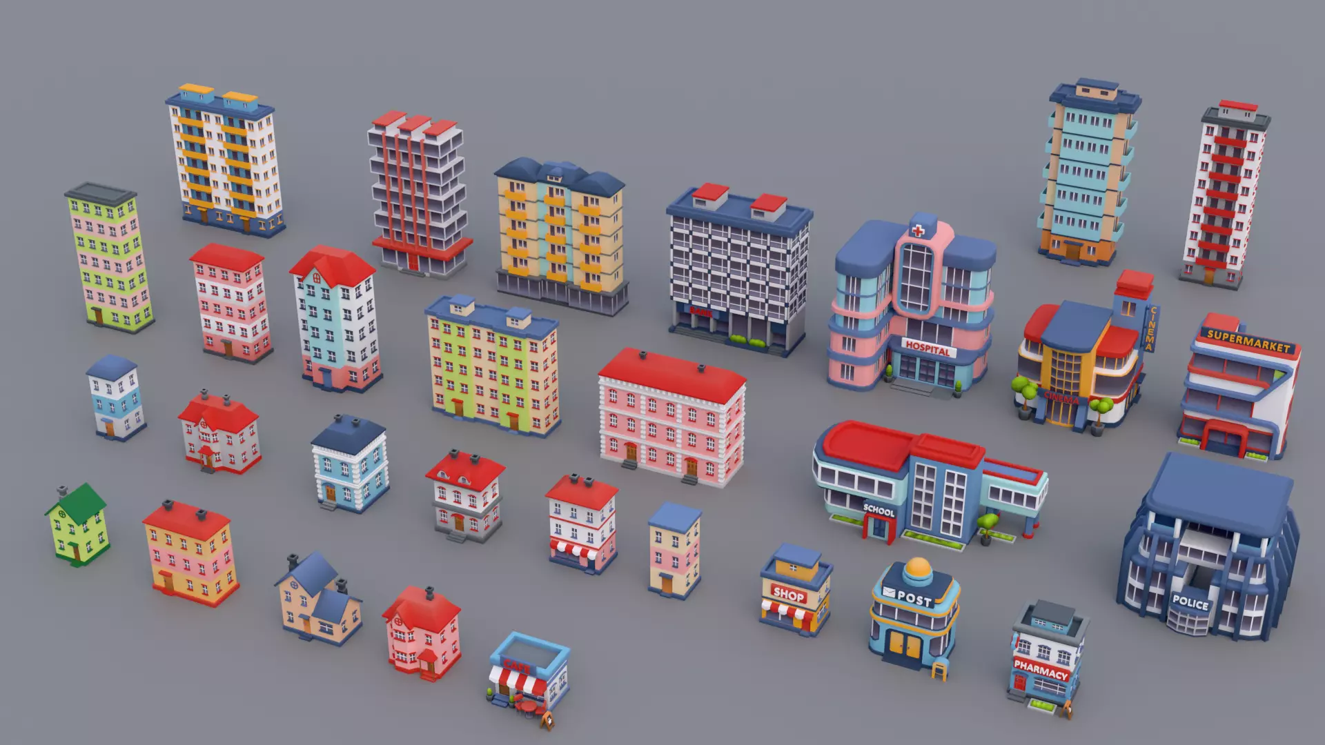 A set of 30 stylized low-poly urban buildings. It includes 20 residential buildings (ranging from small two-story cottages to multi-story apartment complexes), as well as 10 public and commercial buildings: a bank, café, cinema, store, supermarket, hospital, pharmacy, school, police station, and post office. A few trees and grass patches are also included.