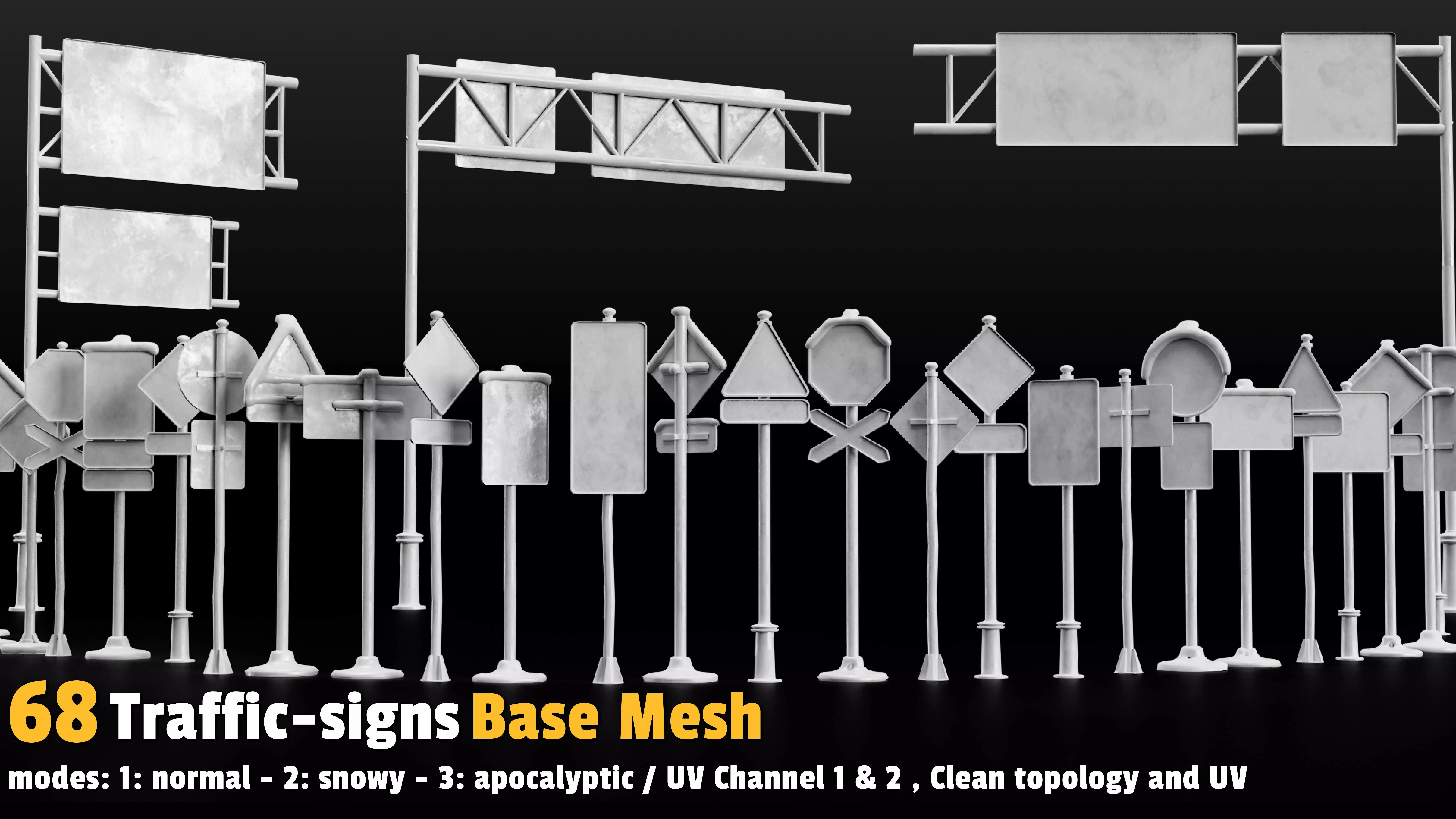 3 modes (Normal, Snowy, Apocalyptic)Clean topology and UVs (UV Channels 1 & 2)Fully customizable and texture-readySuitable for games,and film environmentsCompatible with any software: The models can be easily used in any 3D software.This pack allows you to optimize your game environment creation process effortlessly. Save valuable time and move your work forward faster by using these pre-made base meshes instead of modeling from scratch.Flexibility in Use: You can easily apply any road sign label to the models, as all the model forms have been crafted with real-world accuracy.