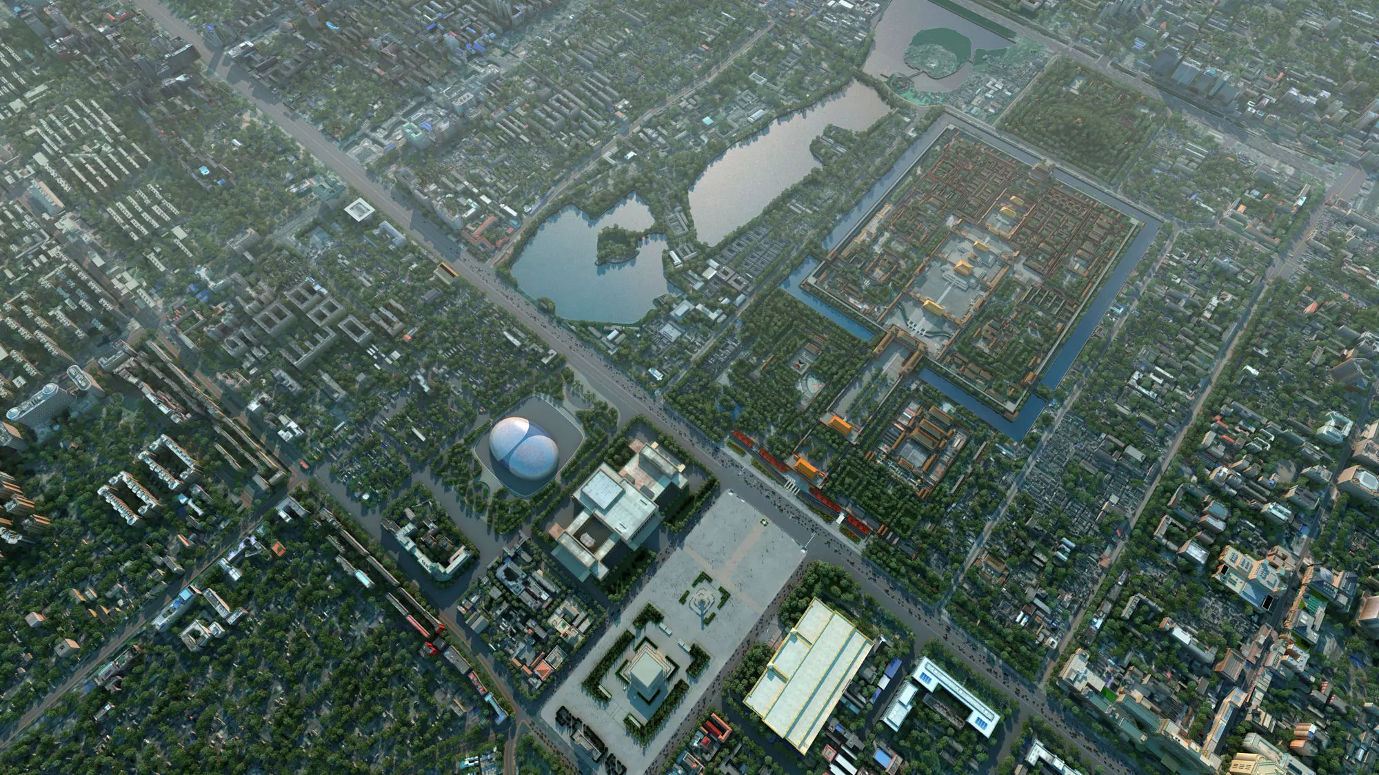 Beijing, abbreviated as Jing, is the capital of the People's Republic of China, the political and cultural center of the country, a world-renowned ancient capital, and a modern international city. Beijing is located at 39 degrees 56 minutes north latitude and 116 degrees 20 minutes east longitude, in the northern part of the North China Plain, adjacent to Tianjin City to the east and Hebei Province to the rest.Tiananmen Square, located on East Chang'an Avenue in Dongcheng District, Beijing, has undergone multiple modifications and changes, ultimately forming a large square with a length of 880 meters from north to south and a width of 500 meters from east to west, covering an area of 440000 square meters. It is the largest urban square in the world. Tiananmen Square has a central axis and symmetrical wings, capable of accommodating a grand gathering of one million people. In the square, along the central axis of Beijing from north to south, stand the national flag pole, the Monument to the People's Heroes, the Mao Zedong Memorial Hall, and the Zhengyangmen City Tower.The Imperial Palace is located in Beijing, China. It was a royal palace during the Ming and Qing dynasties, formerly known as the Forbidden City, and is situated at the center of Beijing's central axis. Centered around the three main halls, the Forbidden City covers an area of approximately 720000 square meters with a construction area of around 150000 square meters. There are over 70 palaces of various sizes, and it is said that the Forbidden City has a total of 9999.5 rooms. In fact, according to experts' on-site measurements in 1973, the Forbidden City had 8707 rooms.The National Centre for the Performing Arts in China was designed by French architect Paul Andreu. The exterior of the National Centre for the Performing Arts is a semi elliptical shape, with a long axis length of 212.20 meters in the east-west direction and a short axis length of 143.64 meters in the north-south direction. The building height is 46.285 meters, covering an area of 118900 square meters, with a total construction area of approximately 165000 square meters, including a main building of 105000 square meters and underground ancillary facilities of 60000 square meters. The total cost is 3.067 billion yuan. There are supporting facilities such as an opera house, concert hall, theater, art exhibition hall, restaurant, audio-visual store, etc.Beijingnan Railway Station, Located in Fengtai District, Beijing, China, it is a first-class station under the jurisdiction of China Railway Beijing Group Co., Ltd. It is also the starting and ending station of Beijing Shanghai Railway, Beijing Shanghai High speed Railway, and Beijing Tianjin Intercity Railway.Model making software: 3ds Max 2014 Rendering software: vray3.60.03 for 3dmax2014Note: The trees in the scene use VRMesh proxy files, which can be copied on a large scale without any lag. All the trees in the scene do not use any tree planting plugins, making it convenient for customers to adjust according to their needs. There are various levels of buildings in the 3ds Max file scene, making it easy for users to choose according to their needs. The buildings and scene refinement in the scene are relatively rich, and objects with a large number of objects are hidden in the layer. It is recommended to use 3ds Max 2014 and later software to open and use it.