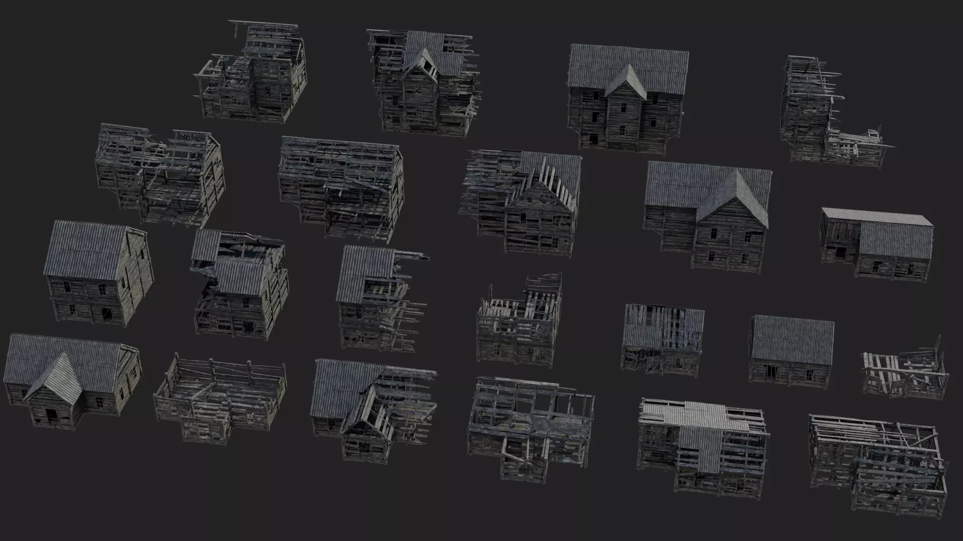 Burned and ruined Wooden Buildings Low-poly 3D model