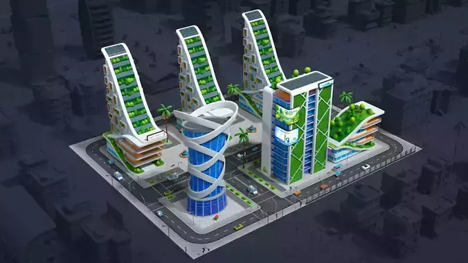 Buildings - Auto service, Bakery, Bar, Books shop, Chicken shop, Clothing, Drug store, Factory, Fast Food, Fruits shop, Gas station, Gift shop, Sky building small and big with color variations, Music store, Pizza, residential building with color variations, shoes shop, Stadium, super market and four type of Modern Houses with three type of texture variations for each model.