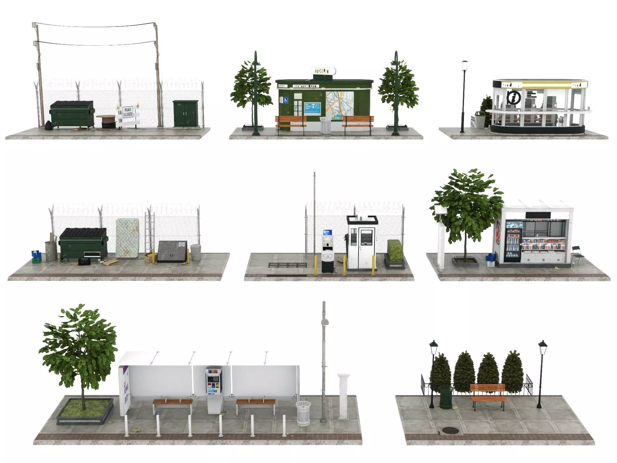 Included Assets:Modular sidewalk and pavement componentsBus shelter with benches and ticket machinesInformation kiosks/city service kiosksPublic toiletsATMs with security boothsStreet shops/small storesFences with wire meshUtilities (electrical boxes, cable reels, utility poles)Trash cans, bins, and trash cansBench, streetlights, bollardsTrees, shrubs, flower bedsRoadside props and environmental debrisSuitable for open-world or city-building gamesArchitectural and urban visualization
