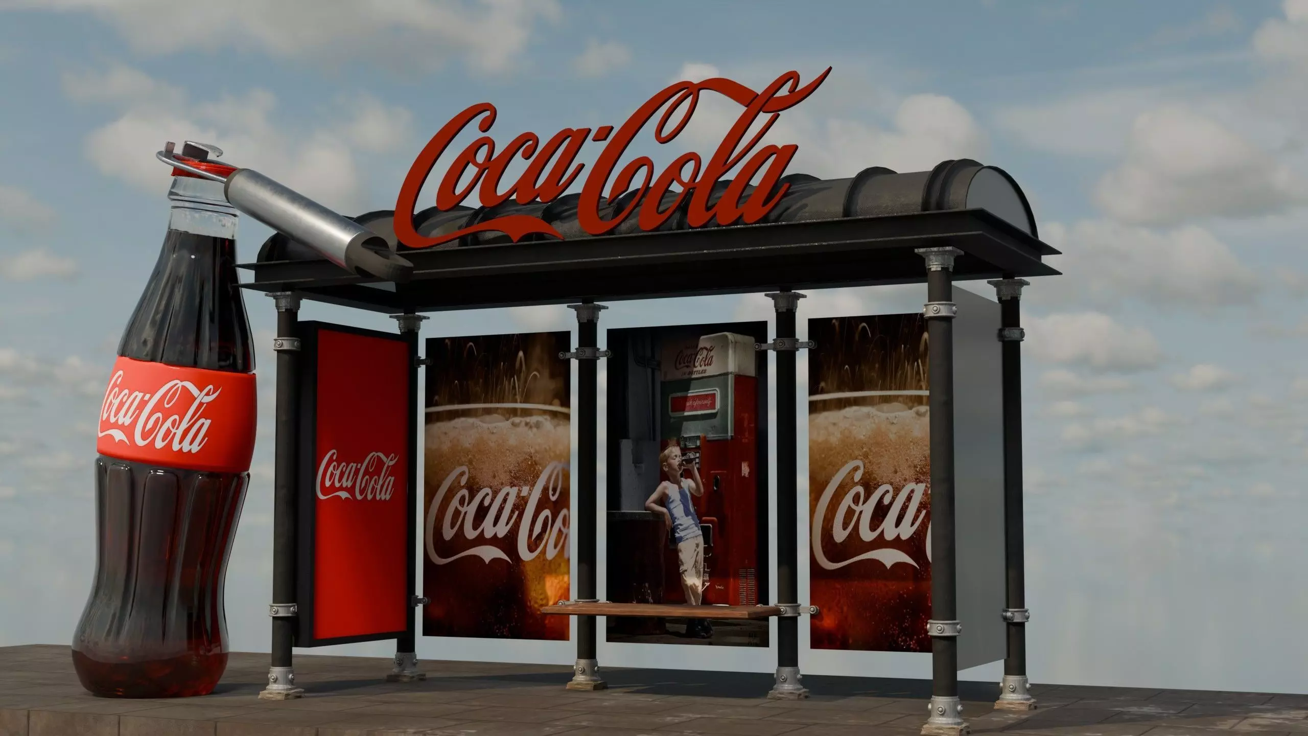 This high-quality 3D model features a creative Coca-Cola themed bus stop designed with eye-catching elements like an oversized glass bottle, a realistic bottle opener, and nostalgic Coca-Cola posters. Perfect for architectural visualization, advertising scenes, or urban props in animation and games. Modeled with attention to detail and optimized for rendering.