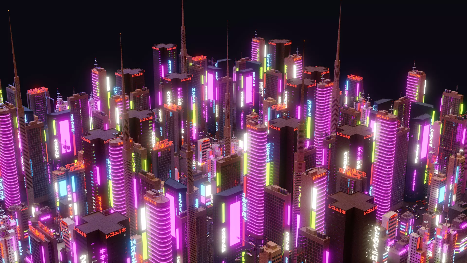 The whole city and neon light uses one simple texture 256x256 gradient for lighting, metal, base color (Include 4 Materials)
