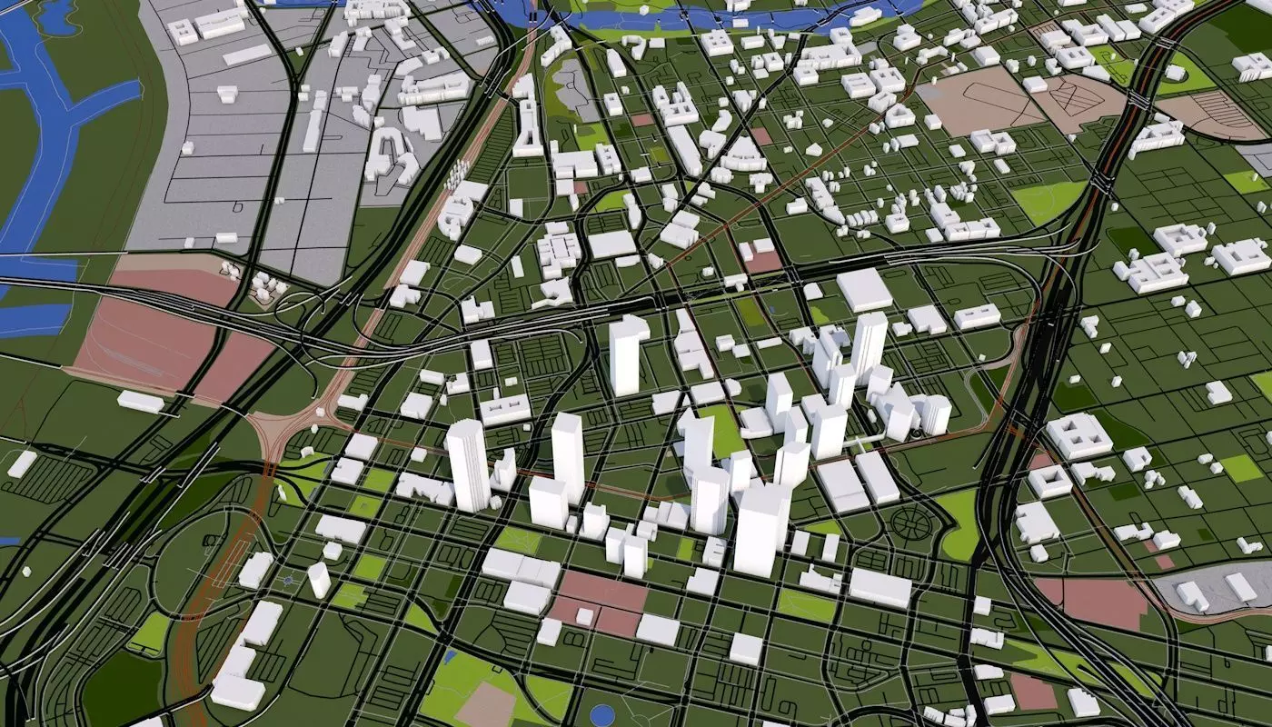 3D representation of Dallas City USA using 2019 map data. Roads, railway, land, water, buildings are made using real world data. Buildings are accurately placed and resembles the real world object up to some extend. Please note that random buildings (varying height) are added to those area where real world data is not available.