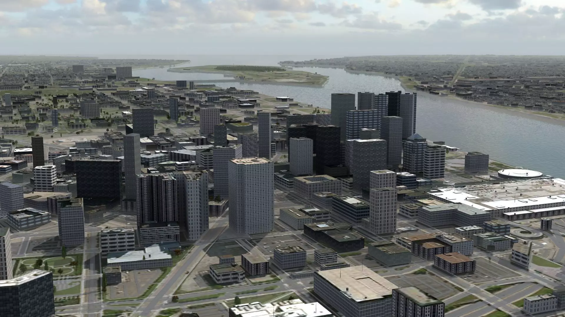 Detroit City, Michigan USA. Covers 25km x 25km, thousands of unique buildings, major and minor roads, sidewalks, trees, bushes and parks, railway tracks, water surface, building rooftop clutter and more.