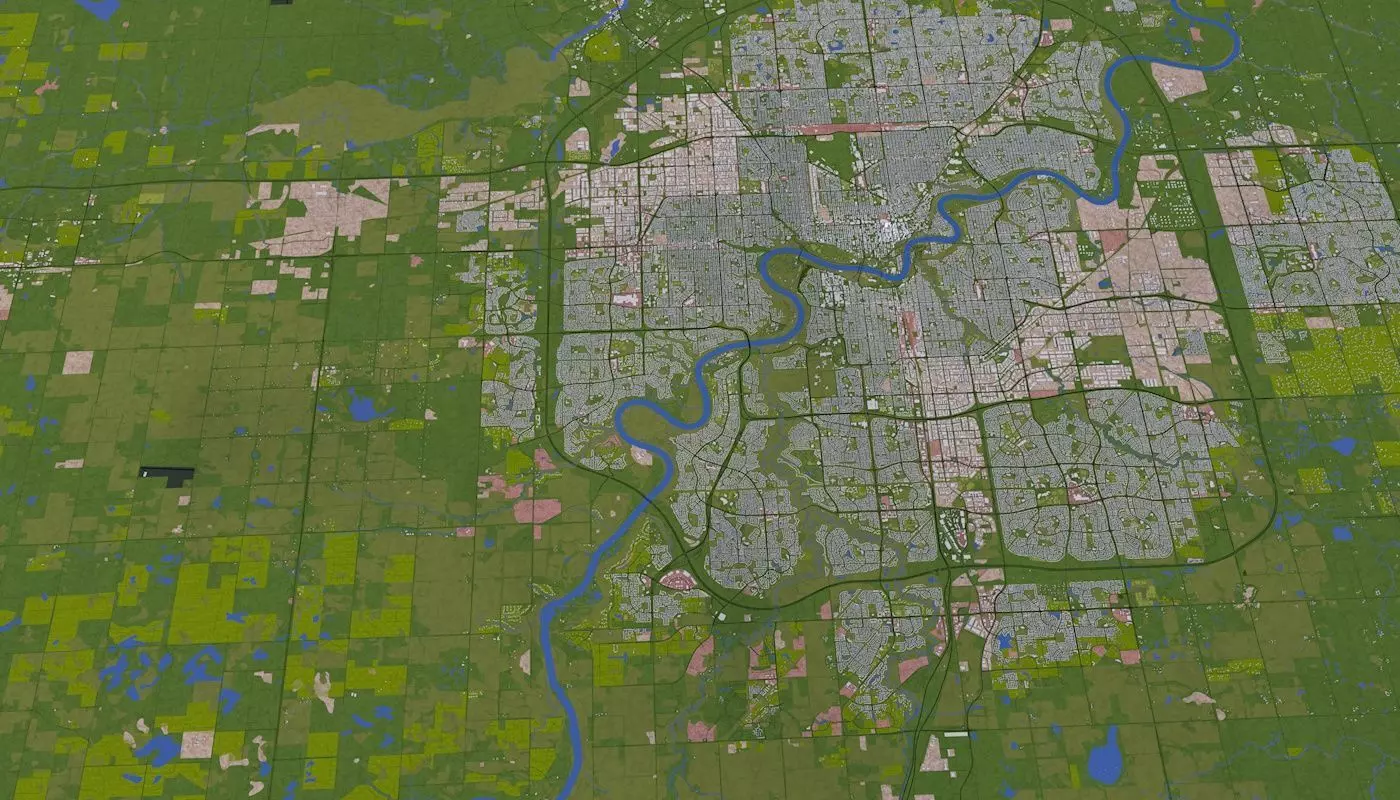 3D representation of Edmonton City Canada_USA using 2019 map data, 52KMx50KM area covered. Roads, railway, land, water, buildings are made using real world data. Buildings are accurately placed and resembles the real world object up to some extend. Please note that random buildings (varying height) are added to those area where real world data is not available.