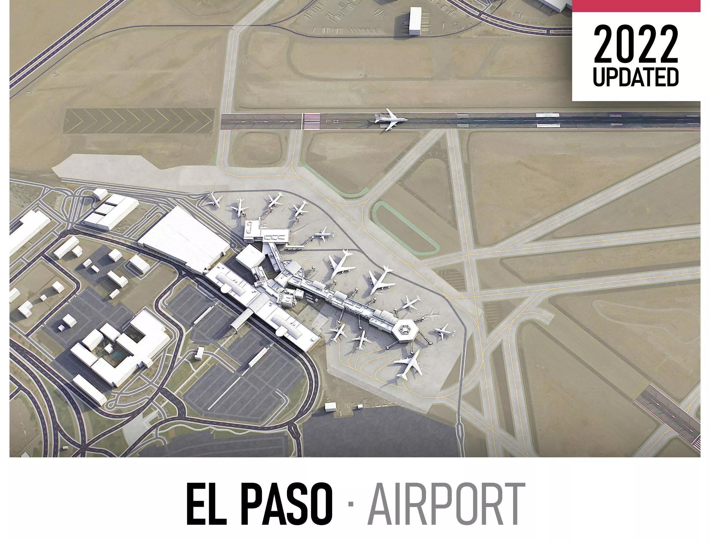 This is exact and accurate to-scale 3D model of El Paso International Airport (ELP) and its surrounding area based on GIS data (March 2022)