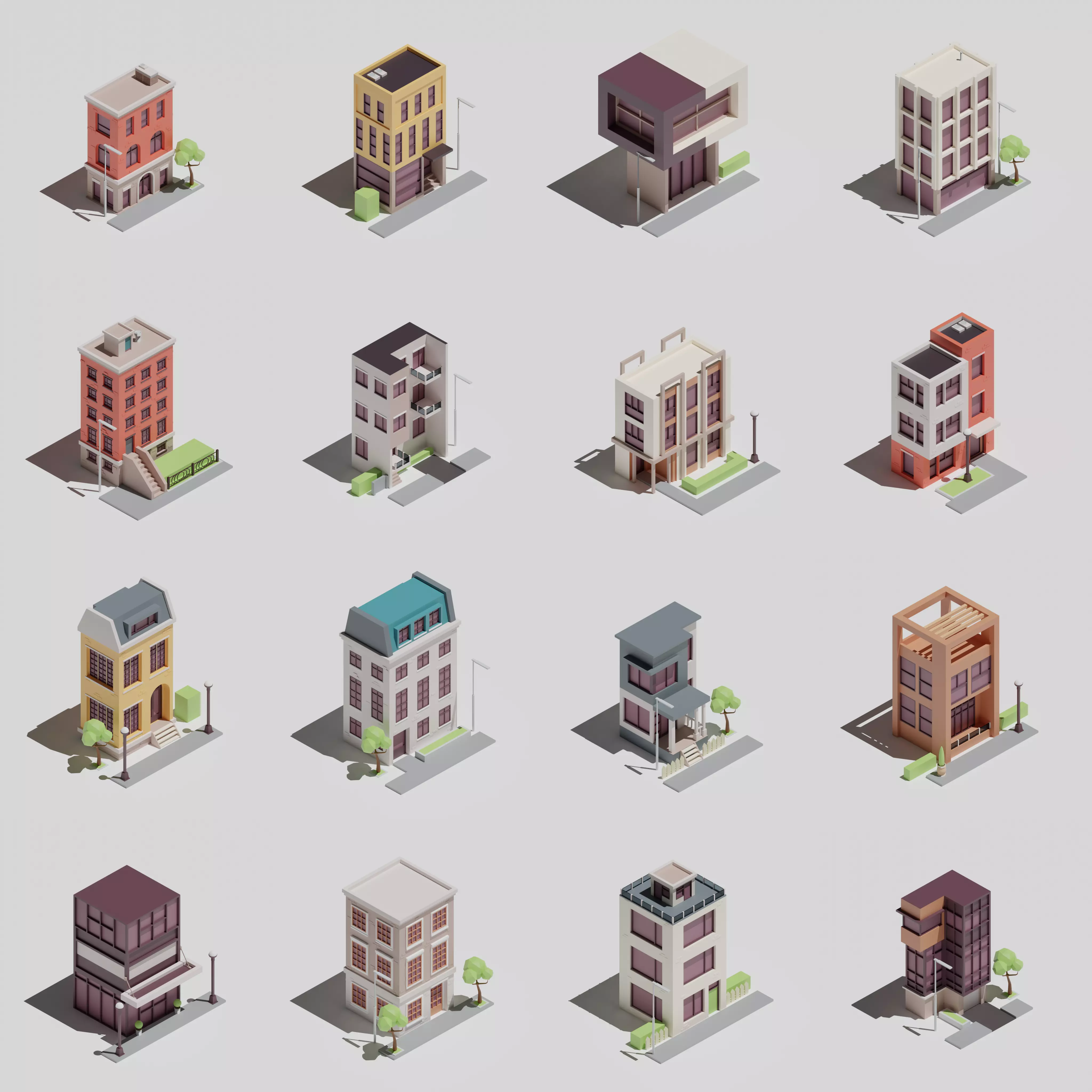 Low poly pack of buildings consists of 16 buildings and sundries.