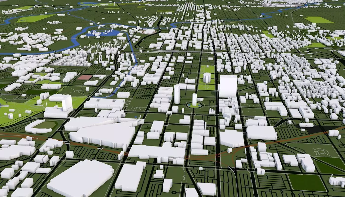 3D representation of Indianapolis City USA using 2019 map data. Roads, railway, land, water, buildings are made using real world data. Buildings are accurately placed and resembles the real world object up to some extend. Please note that random buildings (varying height) are added to those area where real world data is not available.