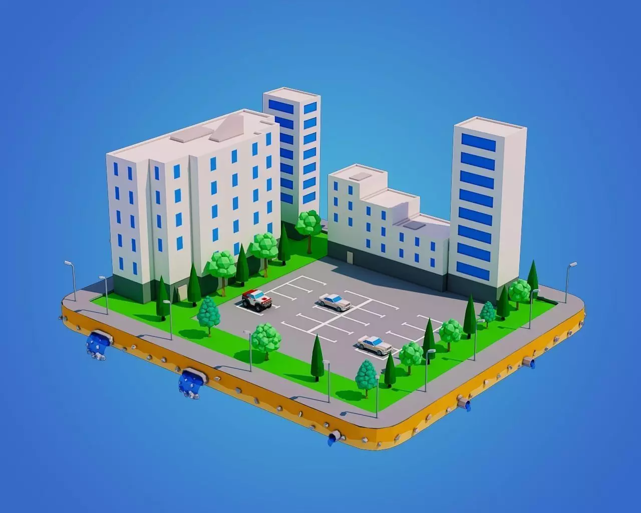 What Included In 3D Model ⦁Three Buildings⦁Three Low Poly Cars⦁Parking⦁Tress and bushes⦁Parts of exterior⦁Platform