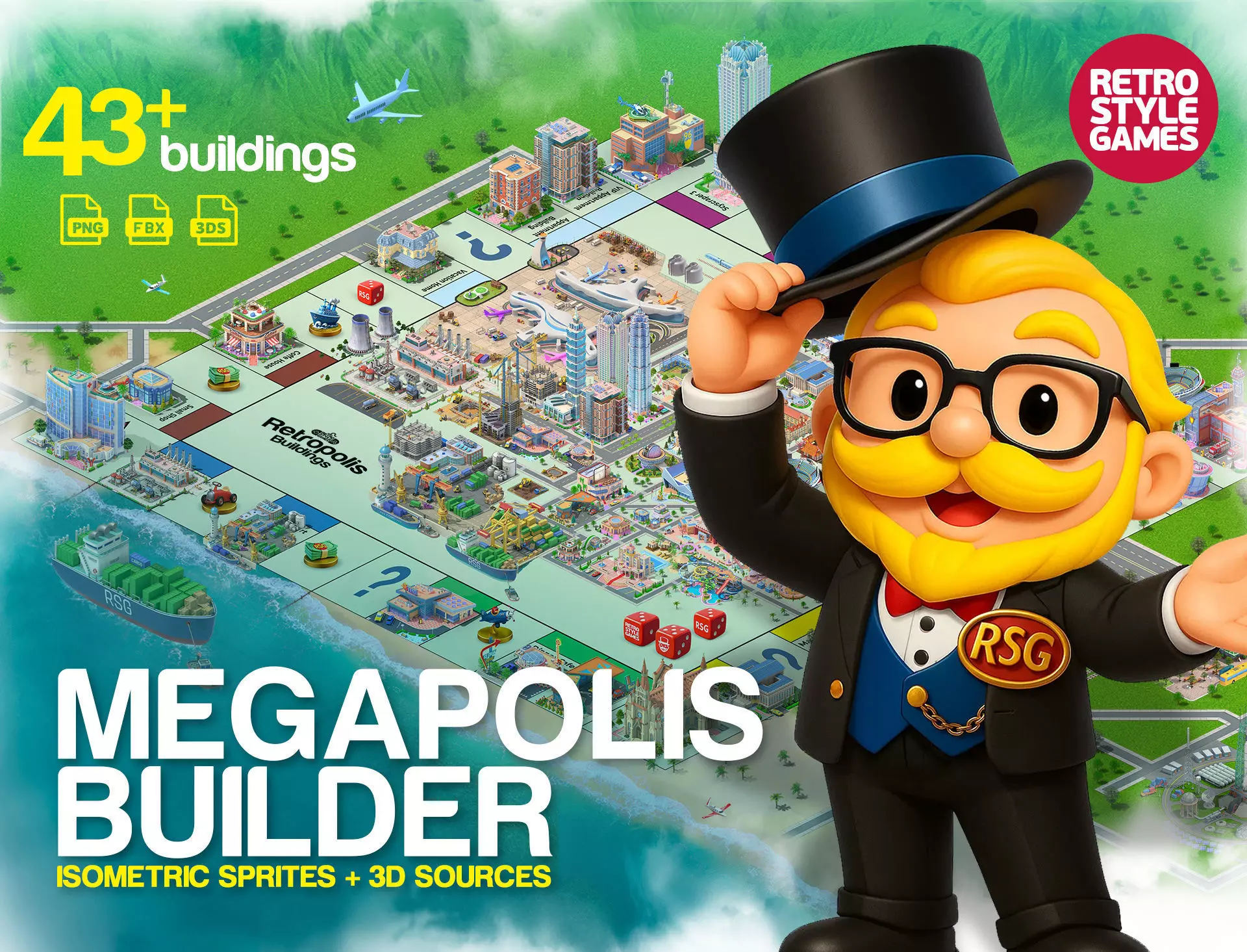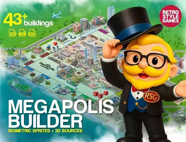 Retropolis сity builder of isometric urban buildings sprites contains a variety of highly detailed buildings and props. Interesting shapes, industrial sites, detailed exteriors, and 3 or 4 levels of awesomeness for construction for each building.