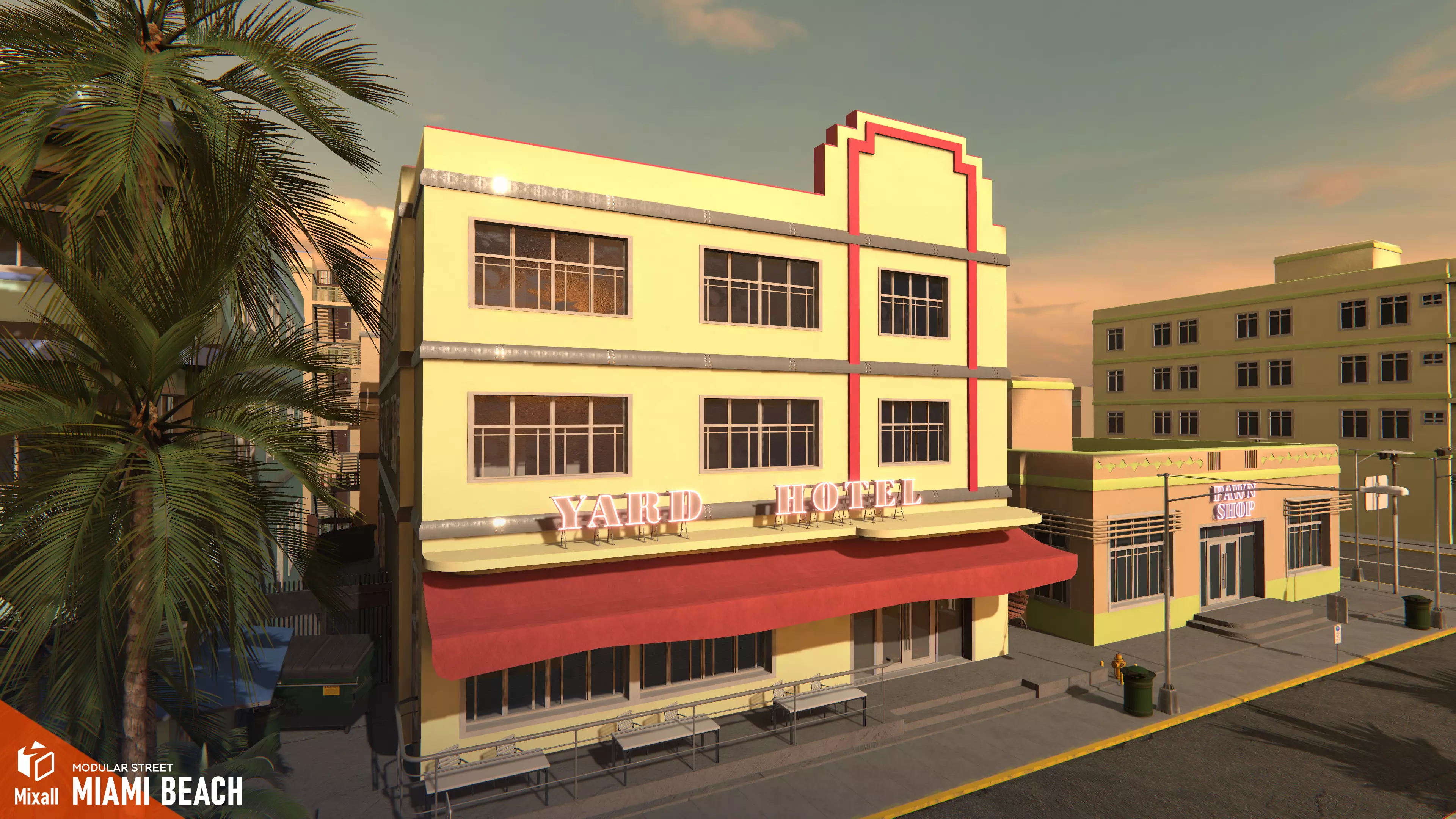 Mixall studio presents a good solution for your games, VR projects and simulators: Miami beach - modular street. The buildings have been designed to reflect the architecture commonly seen in Miami Beach, with realistic textures and materials to bring the scene to life.The asset also includes a variety of other useful items, including palm trees, traffic lights, and road pieces, which can be used to create a detailed and realistic street network. The road pieces come complete with crosswalks and other details to add even more realism to your scene. Key Features modular houses and streetsmany high quality propsarchitecture with high-quality textures and materialsgame ready demo scene Assets Buildings: Hotel_1, Hotel_2, Hotel_3Technique: Hydrant, Lamp Post, LampPost_2, Fast Bike, Motorcycle Sport, Racing CarFurniture: Park Bench, Table, Chair, Deck chair Plants: Bush, Grass, Palm, Palm_sOther: Decal, Doors, Dumpster, Fence, Letter Fastening, Letters, metal_fence, Pavement, Signs, Trashcan, Umbrella, Bicycle Parking