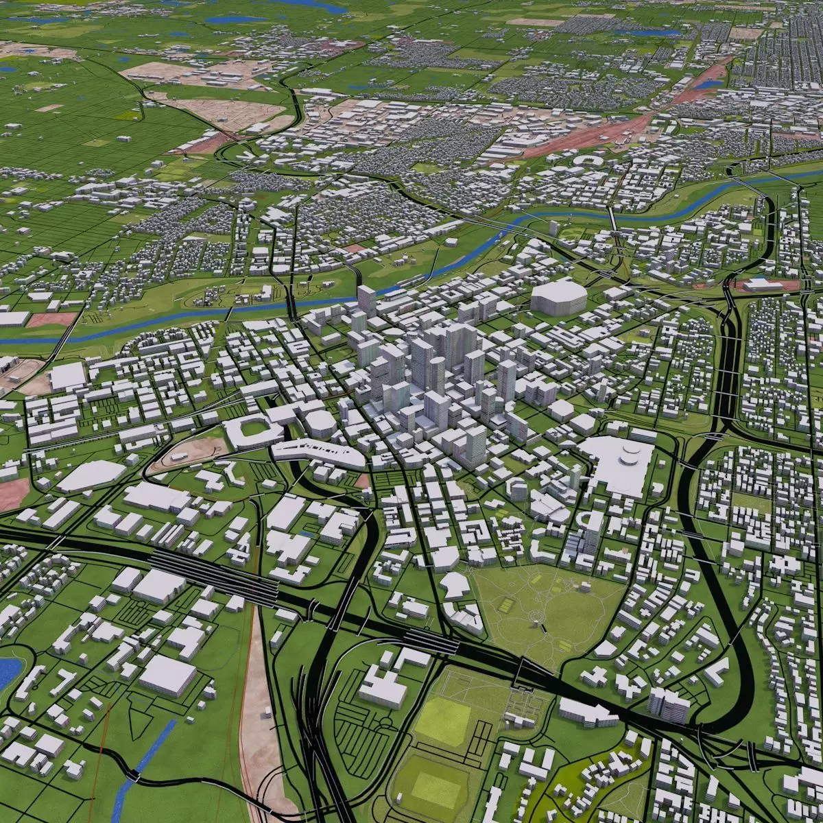 Clean heirarchy- Proper grouping according to the type of real world objects. Properly named objects and materials. Clean Flat UV map- Properly unwrapped UV for most of the objects. Some objects may have cubic mapping applied. Buildings are extracted from real world data. There are random buildings added to some areas where real world data is partially available (missing height details).