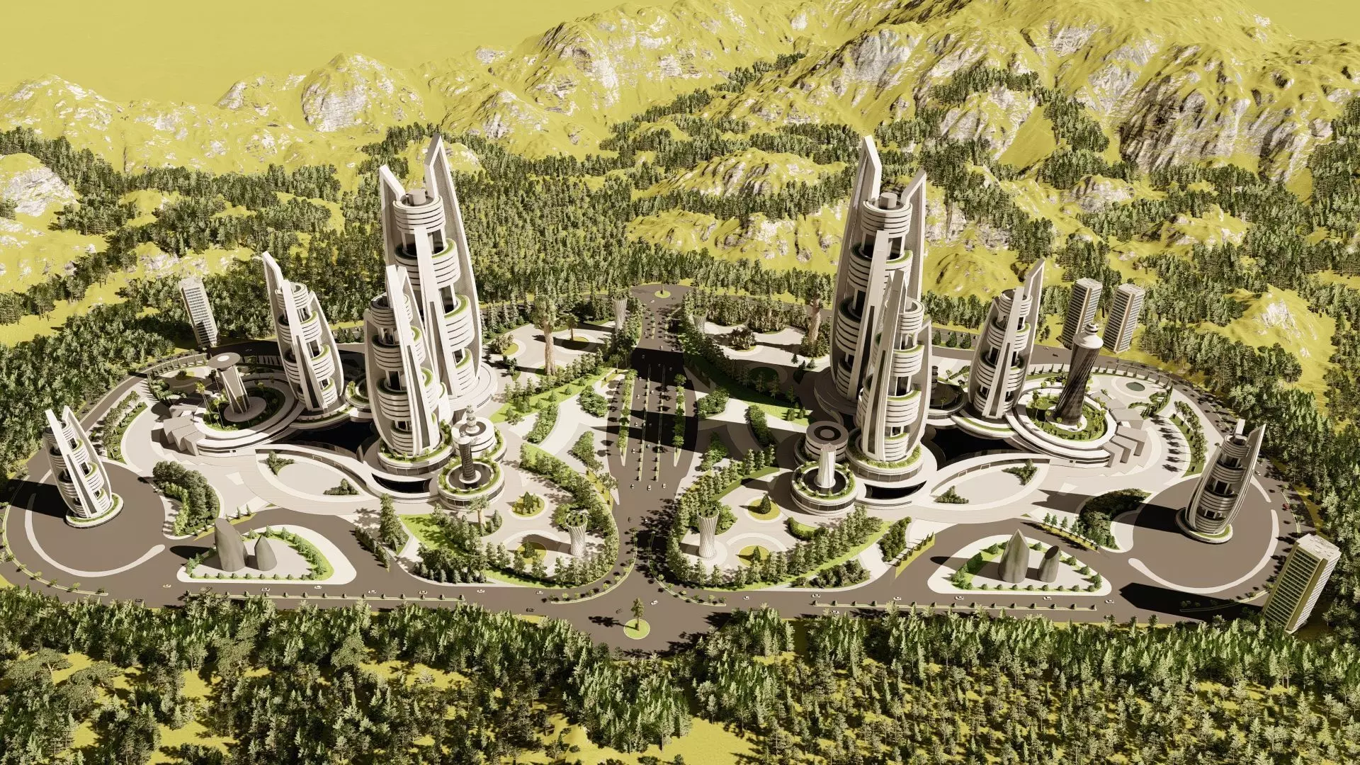 "Immerse yourself in a breathtaking vision of the future with this meticulously crafted 3D cityscape model. This stunning design showcases a harmonious blend of cutting-edge architecture and natural beauty, featuring sleek, futuristic towers nestled within a lush, mountainous landscape.
