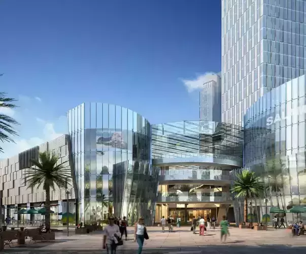 The scene features complex glass-curtain wall architecture, retail storefronts, and integrated landscaping that captures the atmosphere of a bustling premium business district.