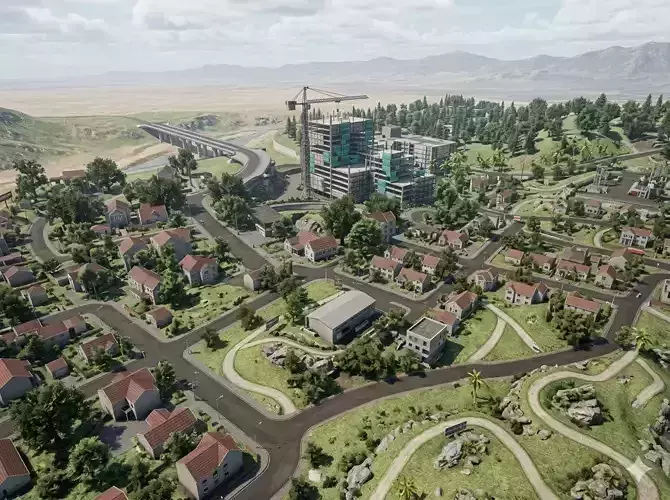 Key Features:Extensive Prop Library: Includes residential homes, commercial buildings, construction sites, and industrial structures.Diverse Terrain: Features a mix of urban asphalt roads, coastal highways, and dirt offroad tracks.Landmarks: Includes hero assets such as a large construction crane, a bridge, a stadium/arena, and a mountain landmark sign.Customizable Layout: All elements are modular, allowing for infinite variations in city layout.