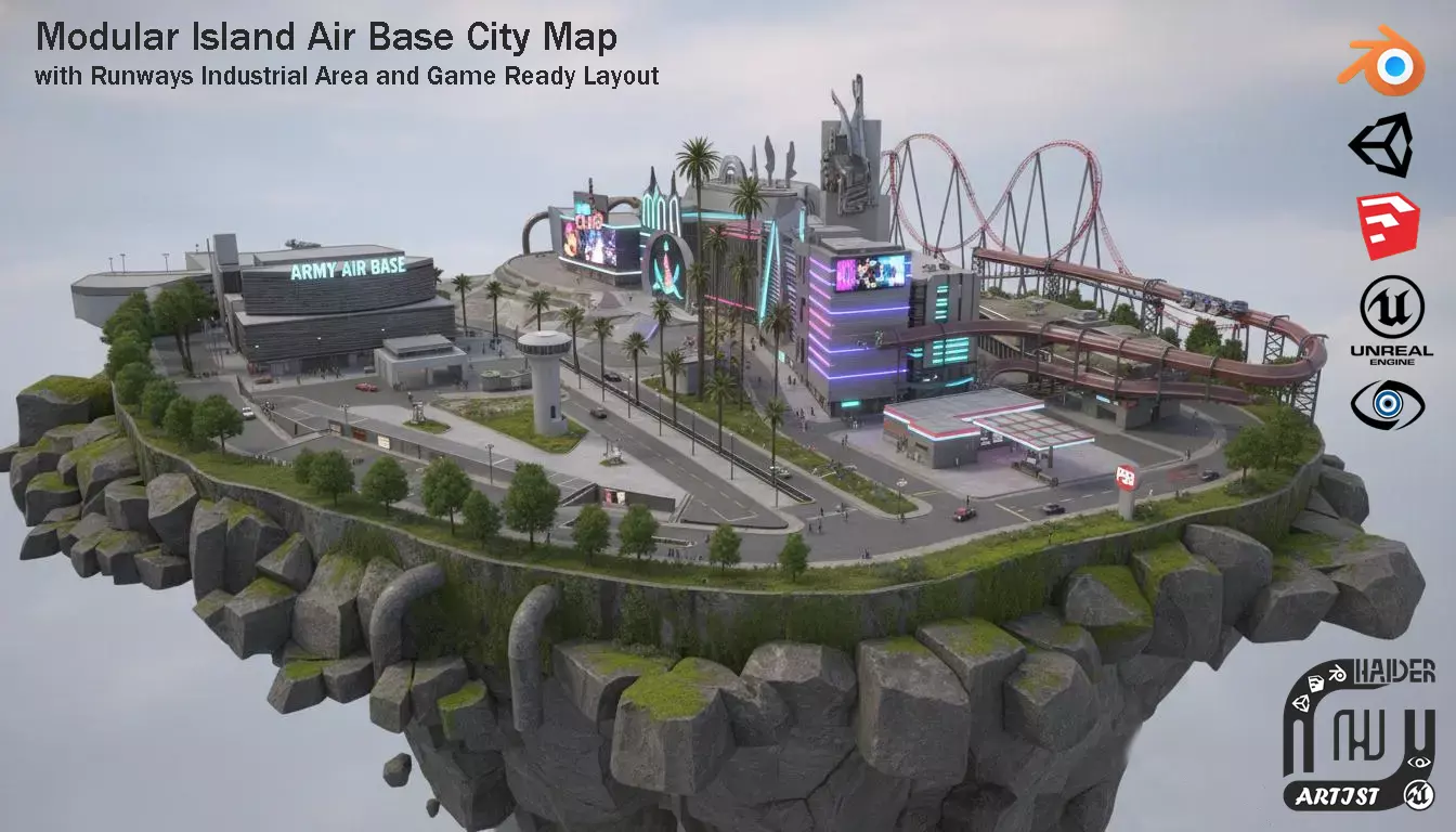 This is a large scale modular island environment map designed for game engines and real time projects. The map is created with a clean and optimized layout to ensure smooth performance without crashes. Two versions of the model are included. One version is fully designed with grass trees and environment details, while the second version is provided without grass and trees so developers can easily add their own vegetation according to game style and story.