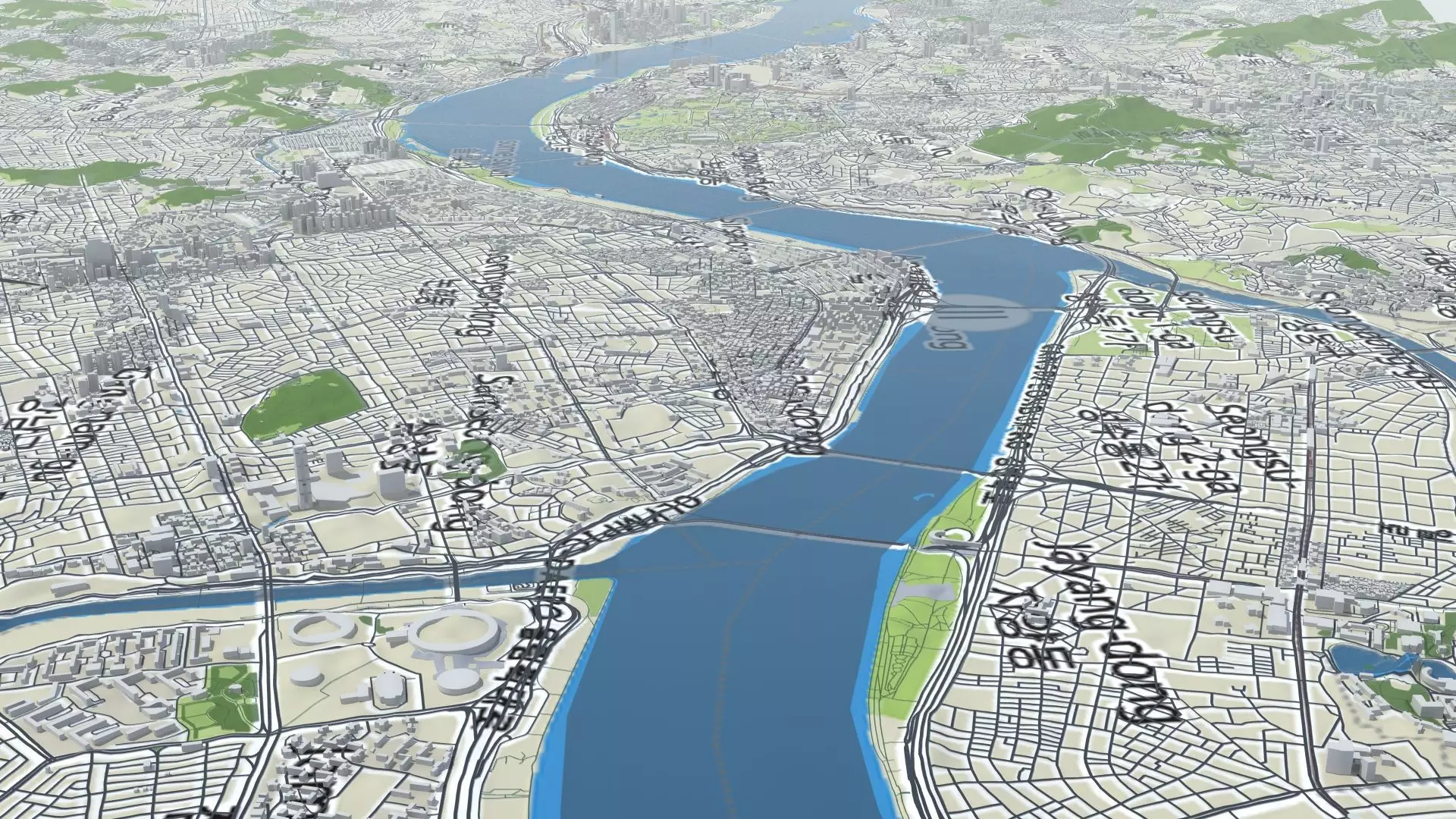 Seoul South Korea. Schematic model of the capital city of South Korea. Thousands of individual buildings in their correct real-world locations, Model covers and area approximately18km x 14.5km, over 261 square km. Layers include buildings, waterways, roads, rail and green spaces. Overlay texture included that shows place names.