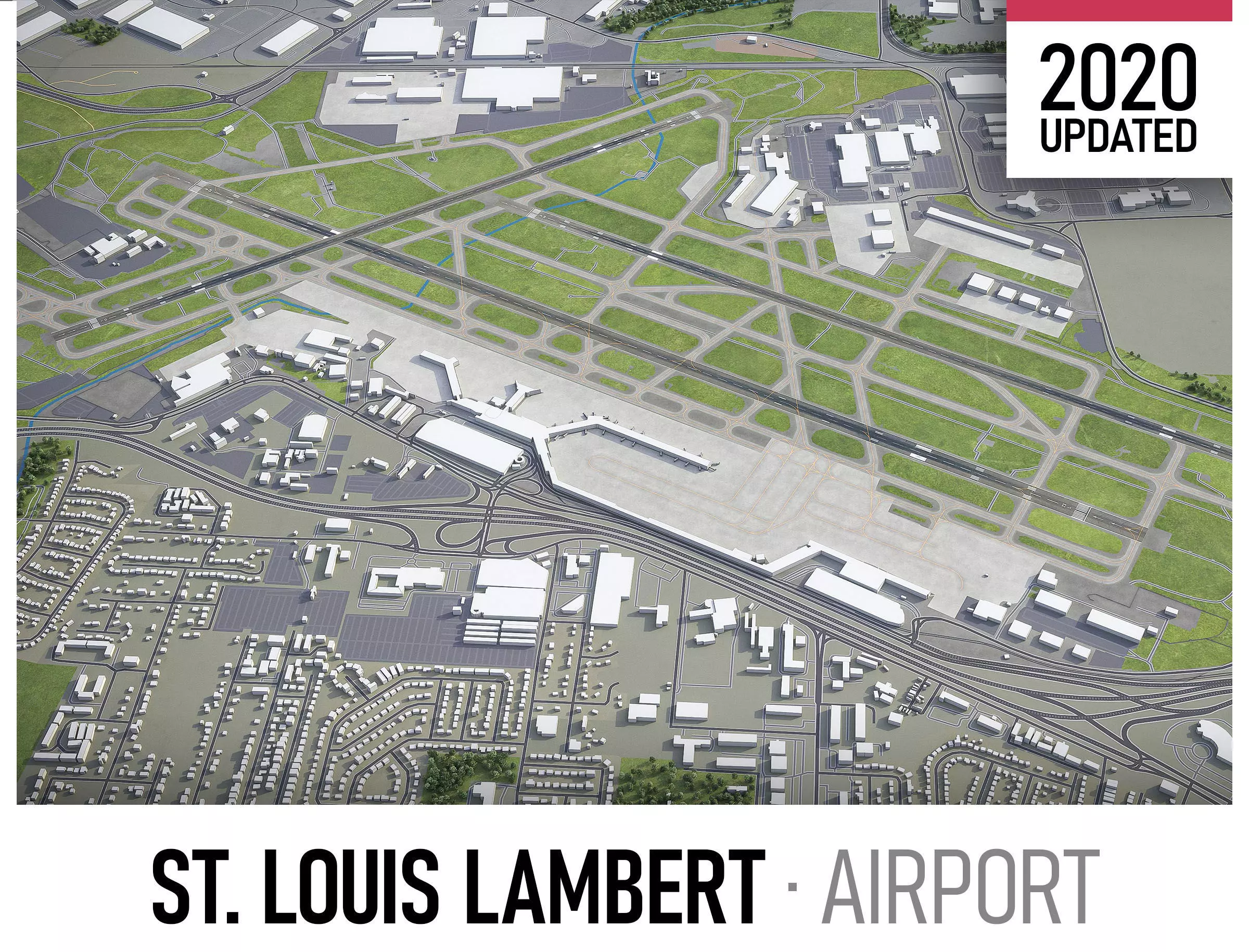 This is exact and accurate to-scale 3D model of St Louis Lambert International Airport (STL) and its surrounding area based on GIS data (March 2021)