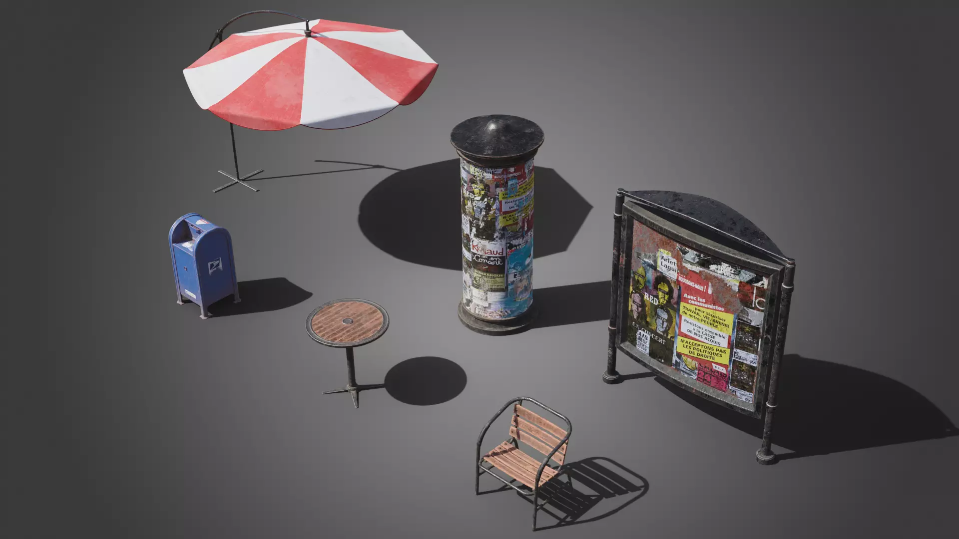 Street props modeled in Blender, and textured with Substance Painter.