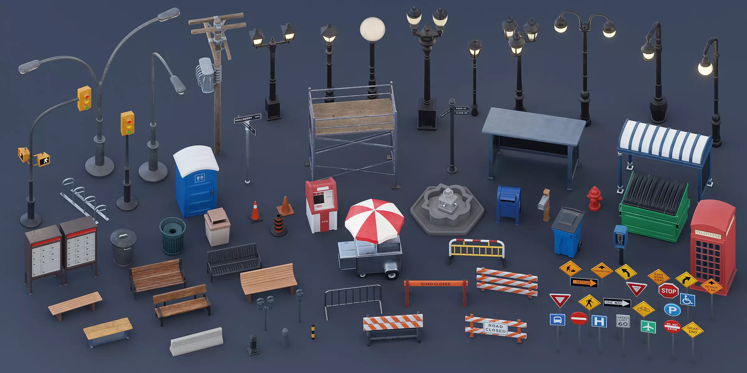 Pack Includes:26 Different Road Signs12 Piece Road Construction Kit (includes barriers, pylons, scaffolding, and more)11 Unique Street Light models 5 Benches and a Picnic Table 4 Mailboxes (Community, Post Office, and Residential)4 Garbage Cans, a Recycle Bin, and a Dumpster3 Bollards 2 Traffic and Crosswalk Lights 2 Bus Stop Shelters 2 Street Signs 2 Phonebooths2 Parking MetersUtility Pole Hotdog Stand Fountain Fire HydrantATM Machine Parking Meter Bike Rack