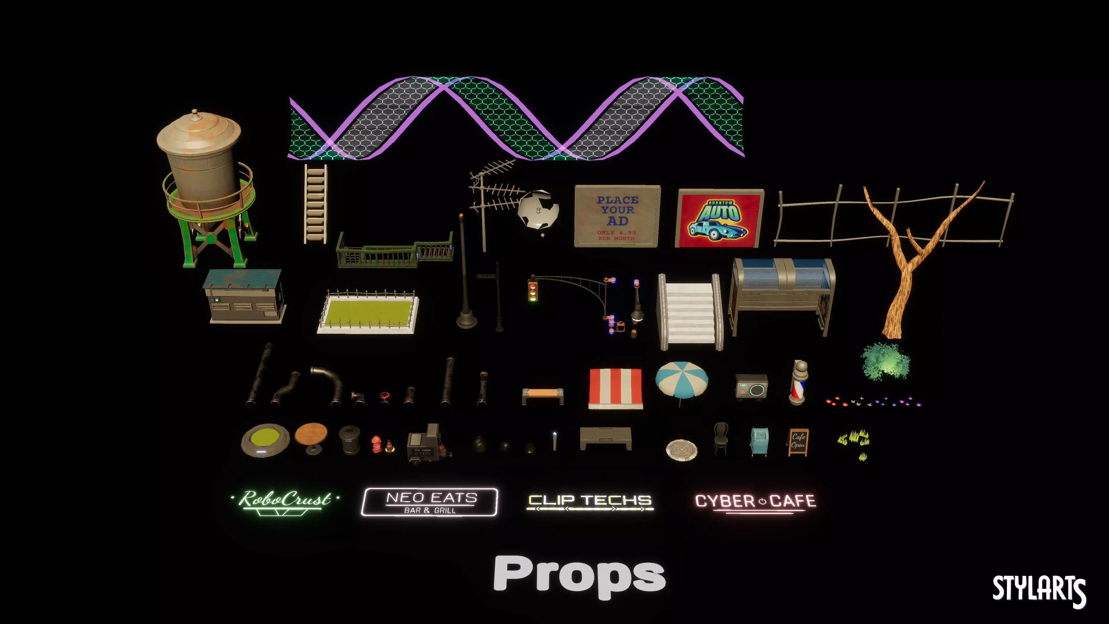 Features:136 Unique MeshesAttention to Detail / AAA QualityControllable parameters in MaterialsHigh-Quality AssetsGame ready/OptimizedUnique Concepts of AssetsHigh Attention to DetailsMaterial Variations For Some AssetsTexture Sizes:20481024Collision: Yes, Custom collisions for complex assetsLODs: YesAverage Poly Count: around 1K up to 11KTexture Map Types: Base Color / Diffuse, Normal, Smoothness / Roughness, Metalic, OpacityMaterials: This asset contains PBR based materials which means each material contains a Base Texture, and a Normal Texture by default and additionally has Smoothness, Ambient Occlusion, Metalic and Opacity Texture Maps according to the material.Props: Tree, Billboard, Bench, Pipes, Hologram, Decals etc.. [Resolution 2048x] [Diffuse, Normal, Roughness, Opacity, AO, Metalic]