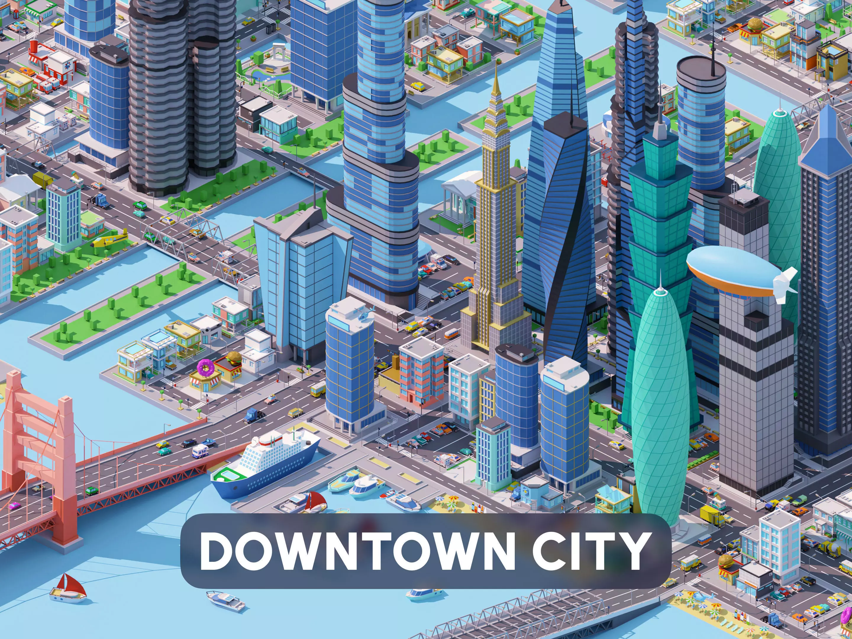 Downtown City is a package of low-polygon 3D models optimized for game engines. It includes 430 assets such as landscapes, buildings, stadiums, and transportation.