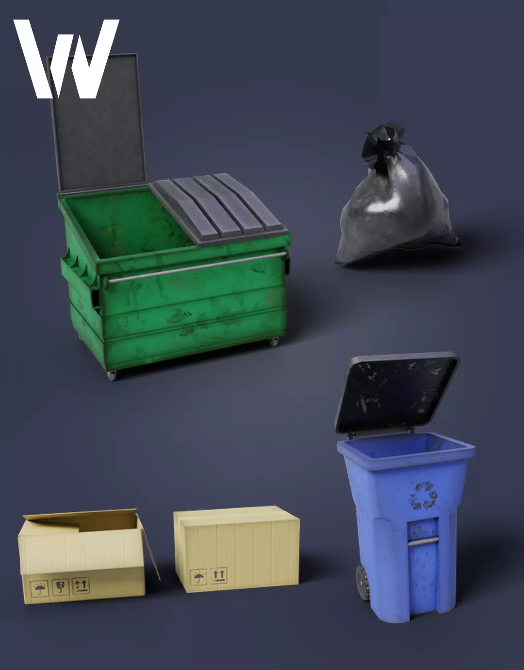 Includes cardboard boxes, garbage bags, and two trash bins.Game-ready assets with optimized topology and 2K textures.Formats: FBX, GLB, OBJ (+MTL), .BLEND.Perfect for alleys and city environments.polygons :