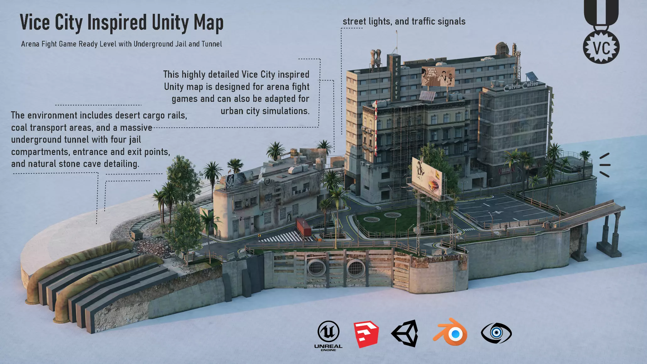 This is the original SketchUp 2026 Pro file of the Vice City inspired 3D city pack, fully designed in SketchUp 2026 Pro. The model includes UV mapped PBR textures, high-quality props, buildings, terrain, tunnels, and all other detailed elements of the city pack.
