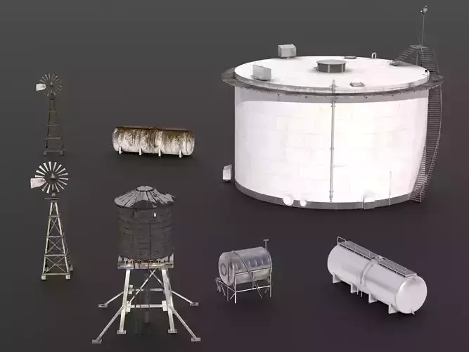 A professional industrial collection of 7 hyper-realistic water tank assets, including various industrial water reservoirs and storage tanks designed for factories, infrastructure projects, utility systems, and industrial environments.