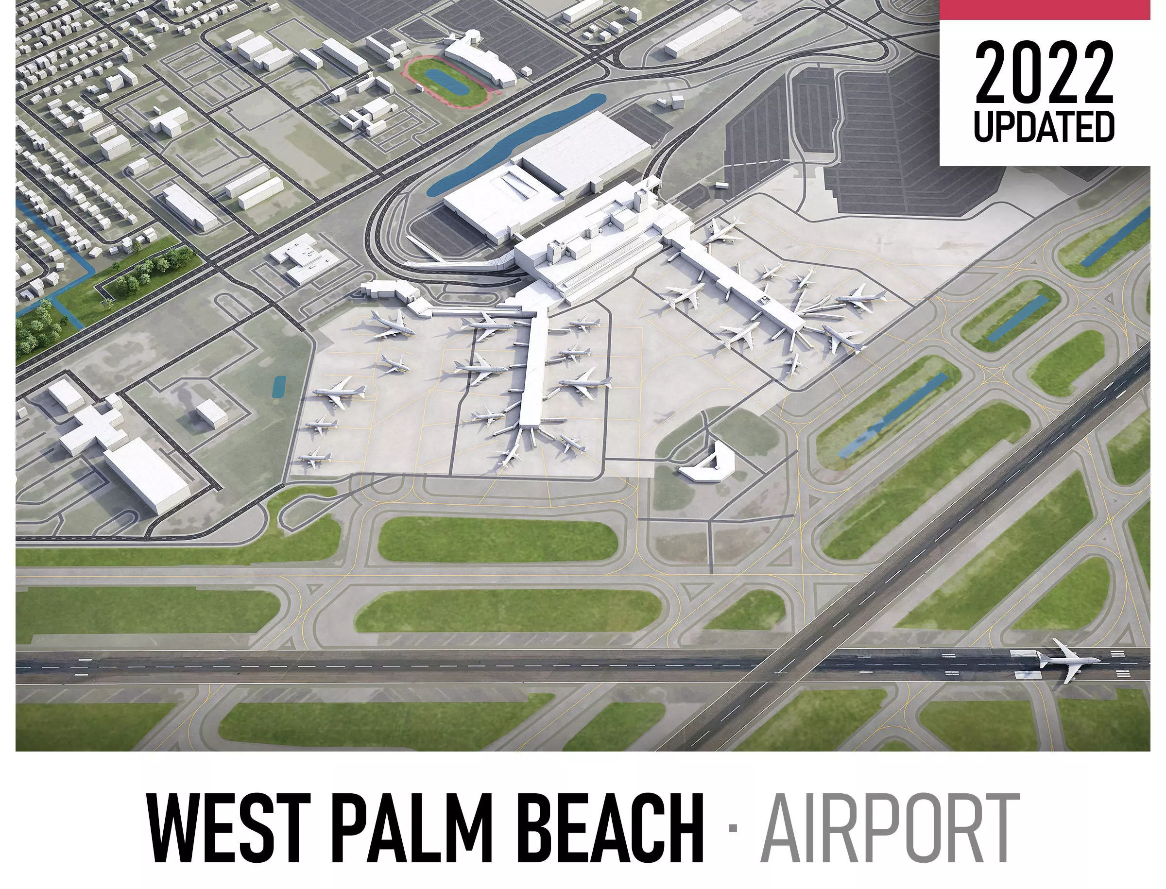 This is exact and accurate to-scale 3D model of West Palm Beach Airport and its surrounding area based on GIS data (January 2022)