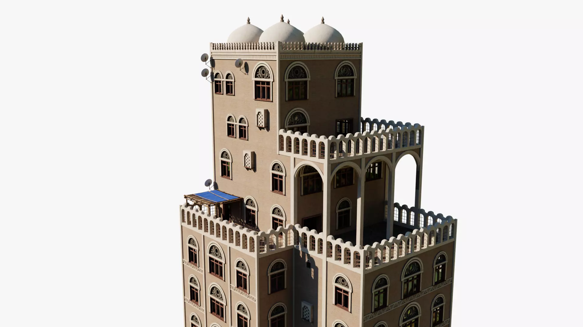 Inspired by traditional Yemeni architecture, featuring characteristic elements such as adobe walls, ornate wooden windows, and distinctive geometric patterns. This Yemeni apartment building consists of multiple floors and rooms. The building includes a detailed exterior and interior made up of modular pieces that allow for customisable layouts. The model is composed of 15 materials with a mix of overlapping and non-overlapping materials.