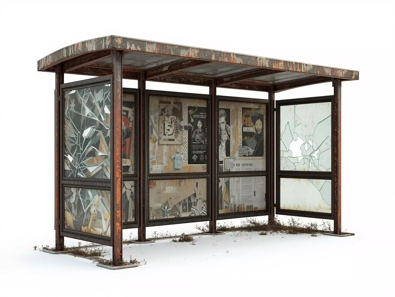 Key FeaturesUrban Decay Prop: Features a typical enclosed bus stop shelter in a state of severe neglect.