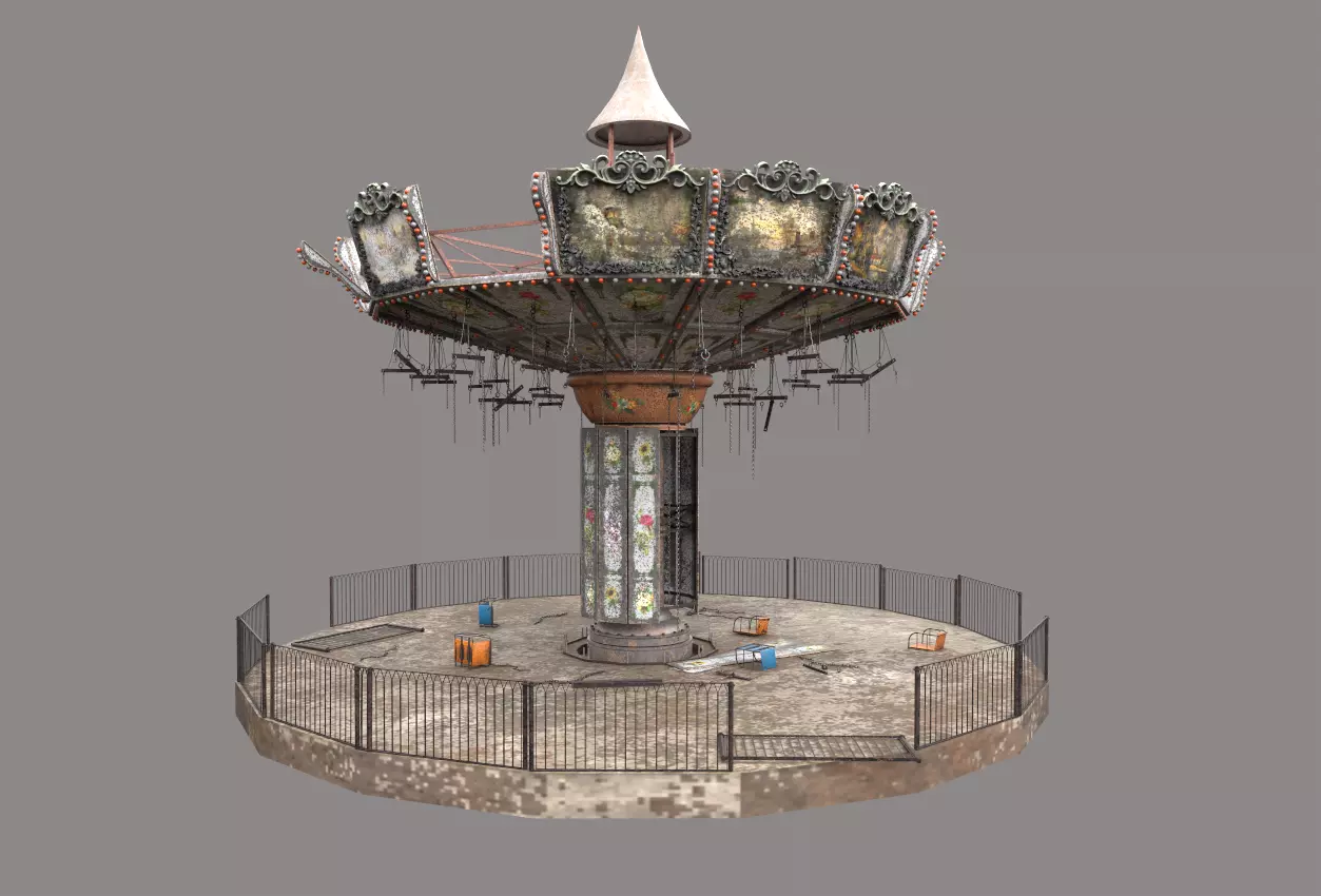 Model of abandoned Swing Ride. Model is very realistic.It has 11 PBR material.Maps are diffuse-specular-glossiness-height and normal. Model's textures has two sizes; 4096x4096-2048x2048. All maps are PNG formats and unwrapped, non-overlapping.