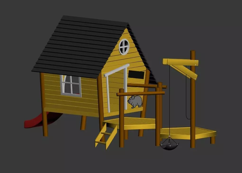 children basin wooden playhouse 3d model.This playhouse is put in the sand,and children in the sand can delivery the sand to the lifting plate,the children on the plstform will send the sand to the house .In the another side children could slide from the house.This playset could load 3-6 kids to play at the same time