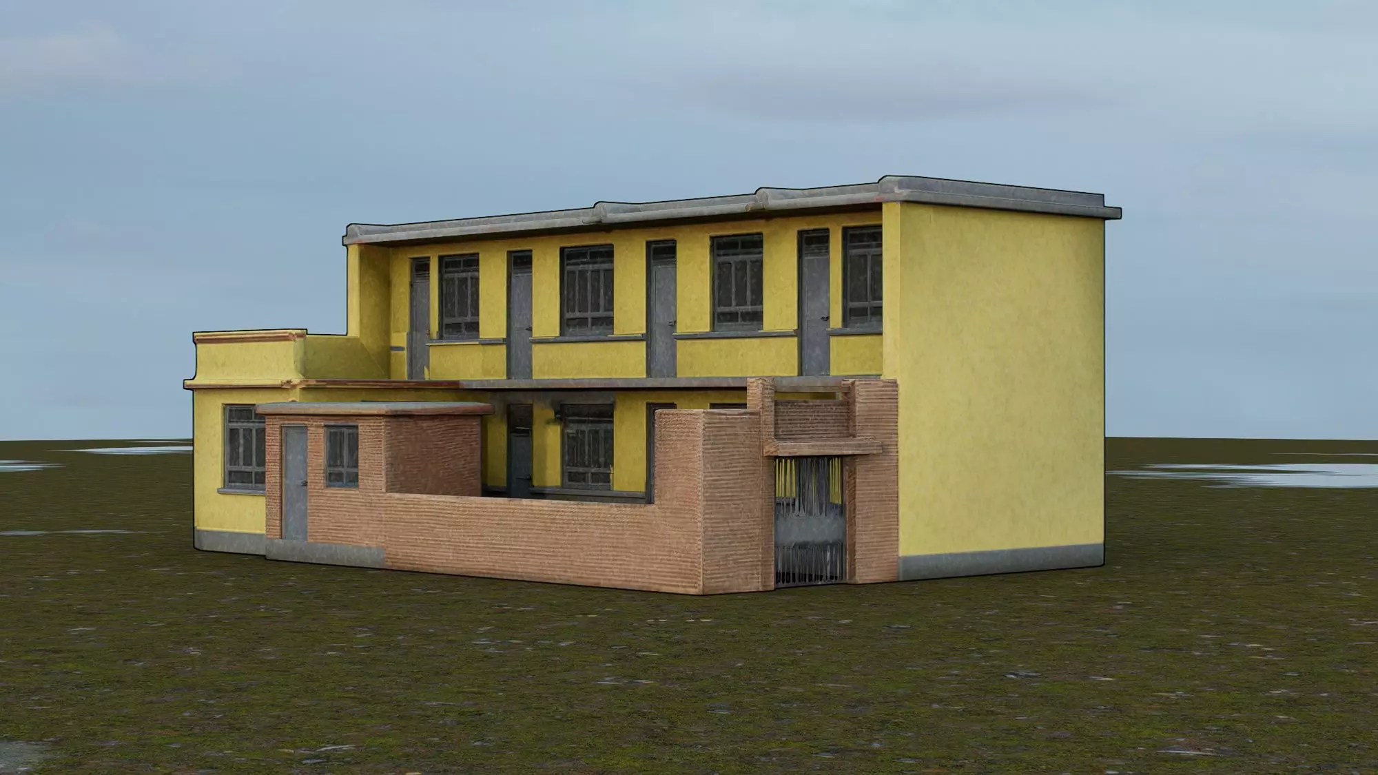 This 3D low-poly model represents a typical Chinese rural primary school, designed with simplicity and functionality in mind. Featuring a two-story rectangular structure with a flat roof, the building showcases yellow exterior walls, gray window frames, and a covered walkway along one side. A small courtyard is enclosed by a low brick wall, providing a secure outdoor space for students. The model includes basic architectural elements such as stairs, windows, doors, and an attached smaller structure—possibly a utility room or storage area—reflecting the modest scale and practical design common in countryside educational facilities. Ideal for use in architectural visualization, game development, or simulation environments, this model captures the essence of rural education infrastructure in China.