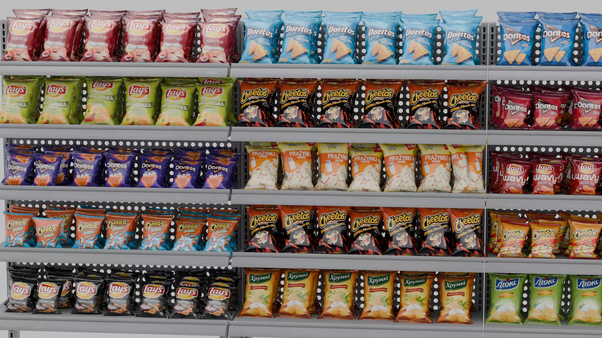 This 3D model created in Blender 4.5, featuring 34 unique chip models arranged on 7 shelves. Works fine in both cycles & eevee render engines.All textures are included, making it ready for rendering in your projects. Perfect for retail scenes, product showcases, or game environments.