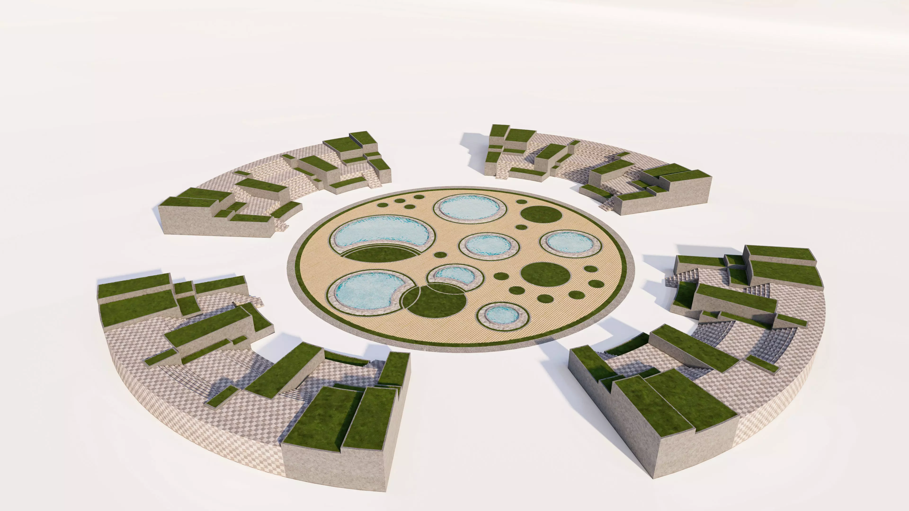 Central Feature: A circular base containing multiple shallow water bodies or reflecting pools of various sizes, interspersed with low-profile circular grass patches. The base is paved with a warm, sandy-toned stone or concrete.