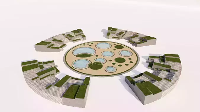 This highly versatile 3D model features a Modular Circular Landscape Design, functioning as a public gathering space, a park focal point, or an outdoor amphitheater. The design emphasizes concentric circles, geometry, and a seamless blend of hardscape and softscape elements.