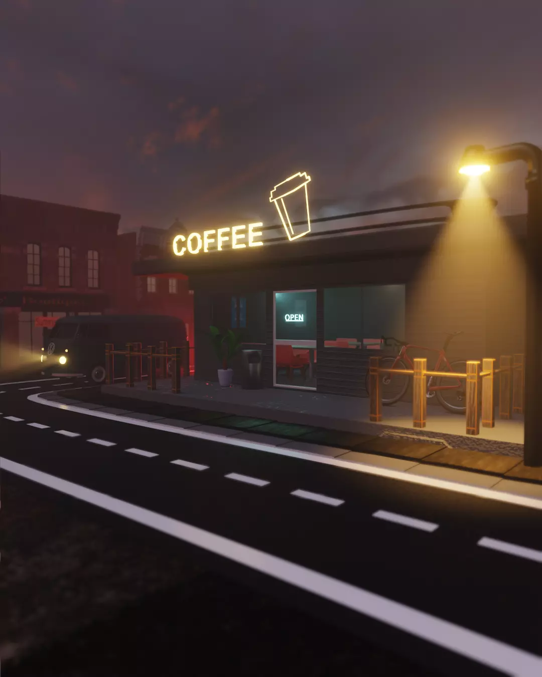 Coffe Shop at night Low poly objects used All common file types attachedAll used textures and HDRs attachedCan run in Both cycles and eeveeIf any texture is missing do check the attached zip file for the sameCreated on Blender3d and is compatible with other formats too48+ hours of work